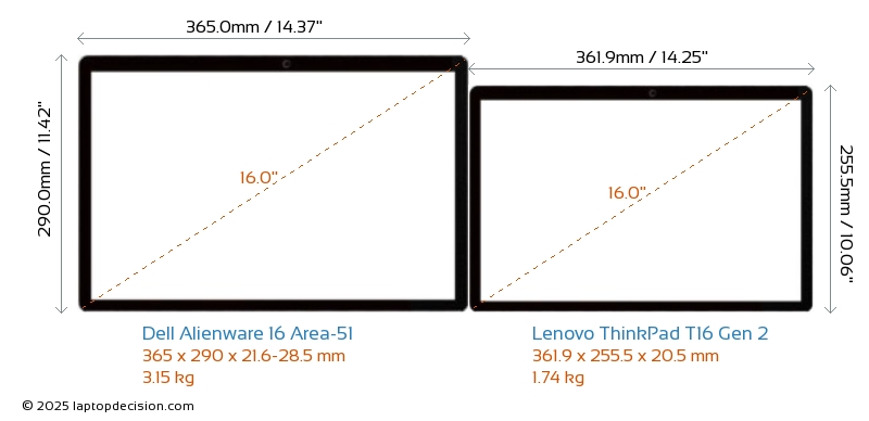 HDMIBoth Alienware 16 Area-51 and ThinkPad T16 Gen 2 feature an HDMI port. Alienware 16 Area-51 offers 1x HDMI 2.1, while ThinkPad T16 Gen 2 offers 1x HDMI 2.0.