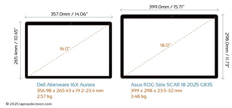 USBBoth Alienware 16X Aurora and ROG Strix SCAR 18 2025 G835 have USB-A ports. Alienware 16X Aurora has 2x USB 3.2 USB-A ports, while ROG Strix SCAR 18 2025 G835 has 3x USB 3.2 USB-A ports.Both Alienware 16X Aurora and ROG Strix SCAR 18 2025 G835 feature 2x USB 4.0 USB Type-C ports.