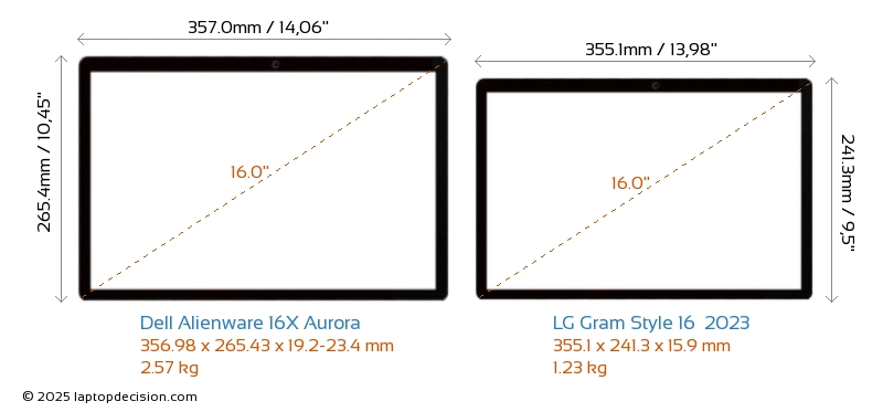 HDMI Alienware 16X Aurora features an HDMI port (1x HDMI 2.1) for connecting to external monitors. Gram Style 16 2023 does not have an HDMI port.