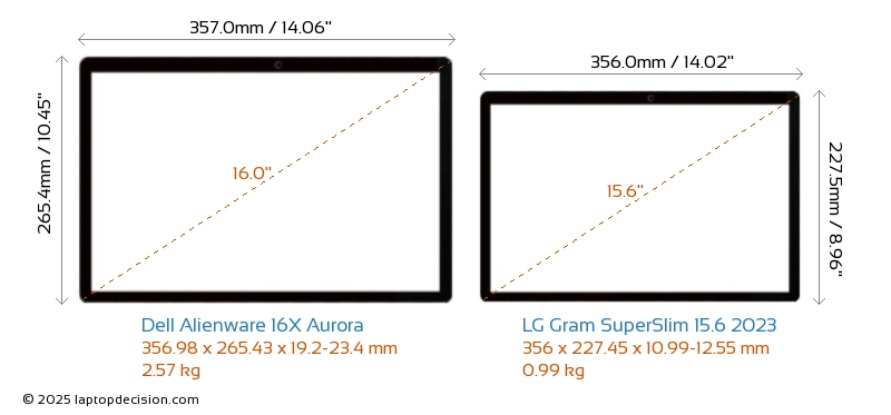 HDMI Alienware 16X Aurora features an HDMI port (1x HDMI 2.1) for connecting to external monitors. Gram SuperSlim 15.6 2023 does not have an HDMI port.