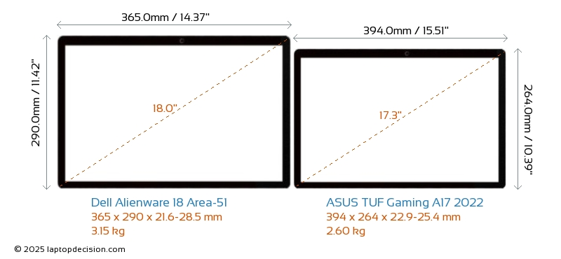HDMIBoth Alienware 18 Area-51 and TUF Gaming A17 2022 feature an HDMI port. Alienware 18 Area-51 offers 1x HDMI 2.1, while TUF Gaming A17 2022 offers 1x HDMI 2.0.