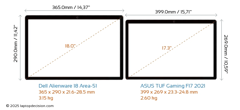 HDMIBoth Alienware 18 Area-51 and TUF Gaming F17 2021 feature an HDMI port. Alienware 18 Area-51 offers 1x HDMI 2.1, while TUF Gaming F17 2021 offers 1x HDMI 2.0.