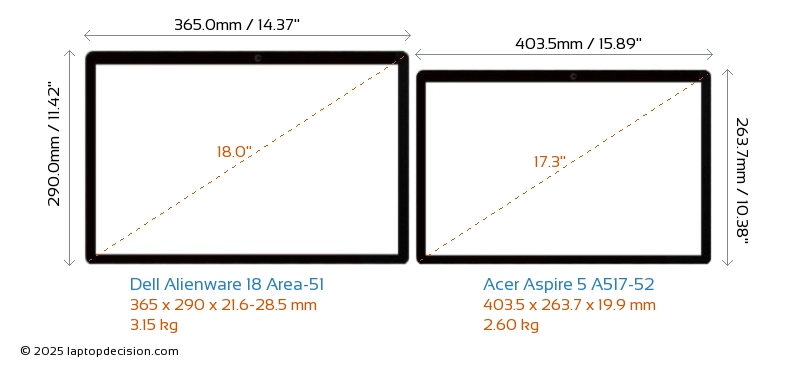 Thunderbolt Alienware 18 Area-51 is equipped with Thunderbolt 5 port. Aspire 5 A517-52 does not have Thunderbolt port.