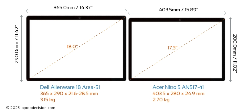 Thunderbolt Alienware 18 Area-51 is equipped with Thunderbolt 5 port. Nitro 5 AN517-41 does not have Thunderbolt port.