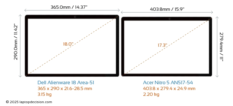 HDMIBoth Alienware 18 Area-51 and Nitro 5 AN517-54 feature an HDMI port. Alienware 18 Area-51 offers 1x HDMI 2.1, while Nitro 5 AN517-54 offers 1x HDMI 2.0.