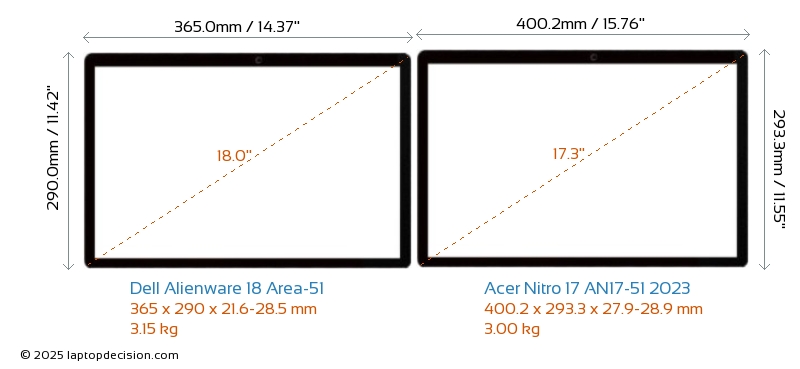 USBBoth Alienware 18 Area-51 and Nitro 17 AN17-51 2023 feature 3x USB 3.2 USB-A ports.Both Alienware 18 Area-51 and Nitro 17 AN17-51 2023 have USB Type-C ports. Alienware 18 Area-51 has 2x USB 4.0 USB Type-C ports, while Nitro 17 AN17-51 2023 has 2x USB 3.2 USB Type-C ports.