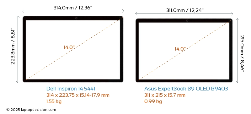 HDMI ExpertBook B9 OLED B9403 features an HDMI port (1x HDMI 2.1) for connecting to external monitors. Inspiron 14 5441 does not have an HDMI port.