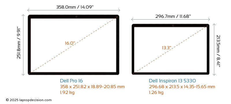 HDMIBoth Pro 16 and Inspiron 13 5330 feature an HDMI port. Pro 16 offers 1x HDMI 2.1, while Inspiron 13 5330 offers 1x HDMI 1.4.