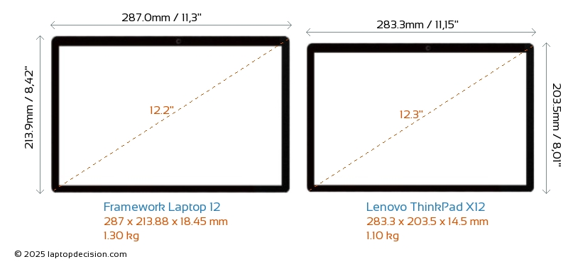 USB Laptop 12 is equipped with 4x USB 3.2 USB-A ports. ThinkPad X12 does not have USB-A ports.Both Laptop 12 and ThinkPad X12 have USB Type-C ports. Laptop 12 has 4x USB 4.0 USB Type-C ports, while ThinkPad X12 has 2x USB 4.0 USB Type-C ports.