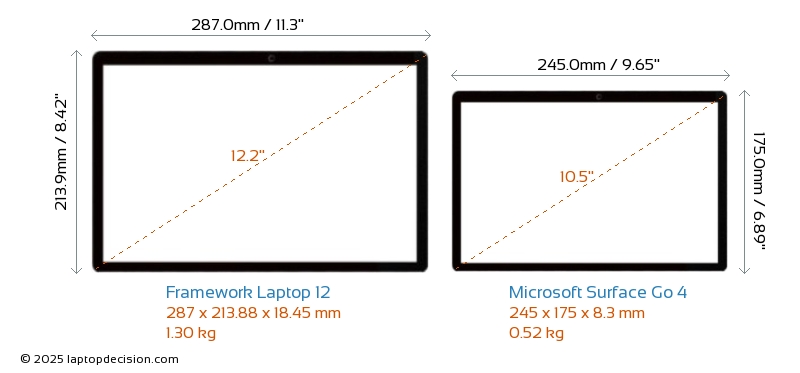 USB Laptop 12 is equipped with 4x USB 3.2 USB-A ports. Surface Go 4 does not have USB-A ports.Both Laptop 12 and Surface Go 4 have USB Type-C ports. Laptop 12 has 4x USB 4.0 USB Type-C ports, while Surface Go 4 has 1x USB 3.1 USB Type-C ports.
