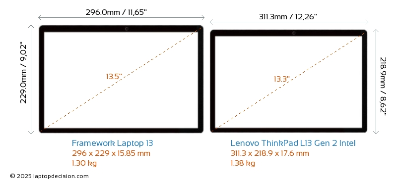 USB ThinkPad L13 Gen 2 Intel is equipped with 2x USB 3.2 USB-A ports. Laptop 13 does not have USB-A ports.Both Laptop 13 and ThinkPad L13 Gen 2 Intel have USB Type-C ports. Laptop 13 has 4x USB 4.0 USB Type-C ports, while ThinkPad L13 Gen 2 Intel has 2x USB 4.0 USB Type-C ports.