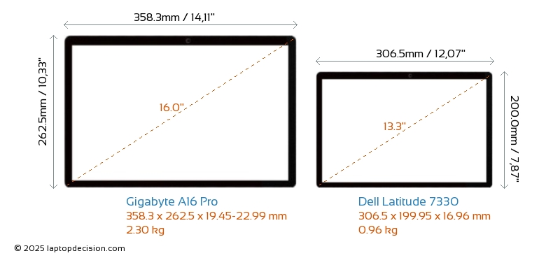 HDMIBoth A16 Pro and Latitude 7330 feature an HDMI port. A16 Pro offers 1x HDMI 2.1, while Latitude 7330 offers 1x HDMI 2.0.