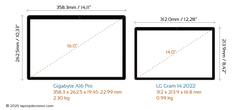 HDMIBoth A16 Pro and Gram 14 2022 feature an HDMI port. A16 Pro offers 1x HDMI 2.1, while Gram 14 2022 offers 1x HDMI 2.0.