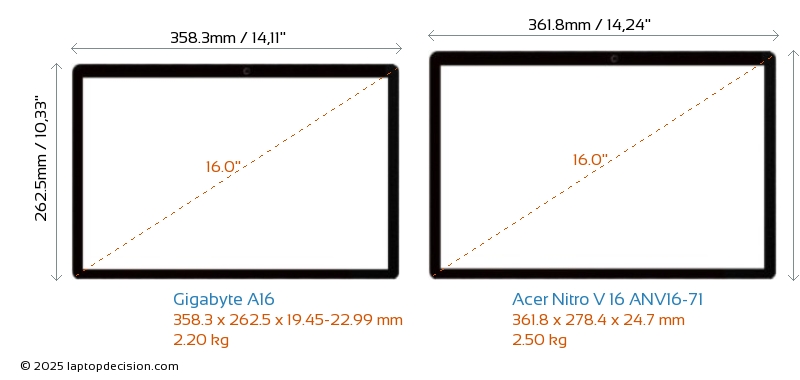 HDMIBoth A16 and Nitro V 16 ANV16-71 feature an HDMI port (1x HDMI 2.1) for connecting to external monitors.