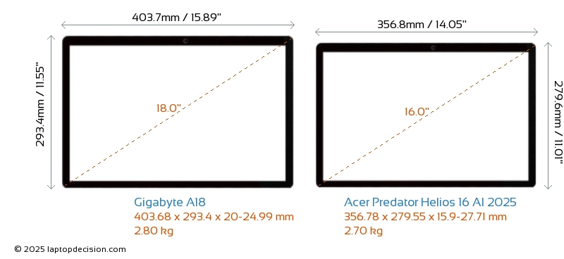 USBBoth A18 and Predator Helios 16 AI 2025 feature 3x USB 3.2 USB-A ports.Both A18 and Predator Helios 16 AI 2025 have USB Type-C ports. A18 has 1x USB 3.2 USB Type-C ports, while Predator Helios 16 AI 2025 has 2x USB 4.0 USB Type-C ports.