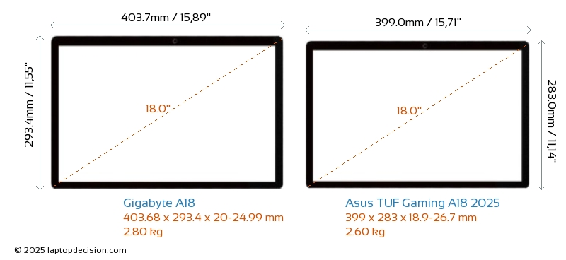 USBBoth A18 and TUF Gaming A18 2025 feature 3x USB 3.2 USB-A ports.Both A18 and TUF Gaming A18 2025 have USB Type-C ports. A18 has 1x USB 3.2 USB Type-C ports, while TUF Gaming A18 2025 has 1x USB 4.0 USB Type-C ports.