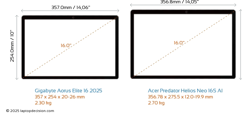 HDMIBoth Aorus Elite 16 2025 and Predator Helios Neo 16S AI feature an HDMI port (1x HDMI 2.1) for connecting to external monitors.