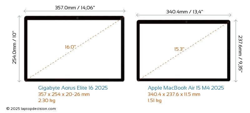 HDMI Aorus Elite 16 2025 features an HDMI port (1x HDMI 2.1) for connecting to external monitors. MacBook Air 15 M4 2025 does not have an HDMI port.