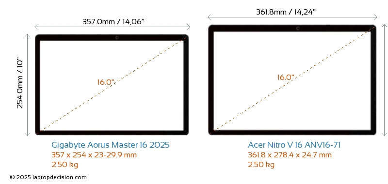 SD Card Reader Aorus Master 16 2025 is equipped with an SD Card Reader for easy access to memory cards. Nitro V 16 ANV16-71 does not have an SD Card Reader.