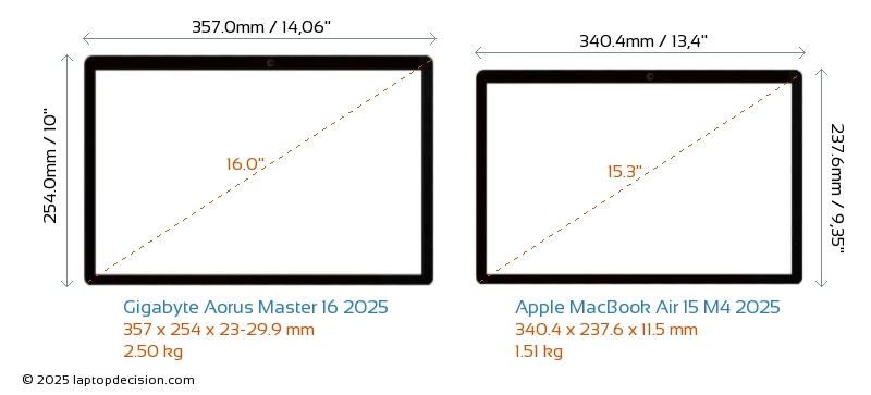 HDMI Aorus Master 16 2025 features an HDMI port (1x HDMI 2.1) for connecting to external monitors. MacBook Air 15 M4 2025 does not have an HDMI port.