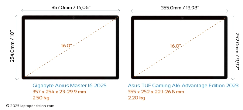 Wifi Aorus Master 16 2025 features a more advanced Wi-Fi standard v7, providing faster and more reliable wireless connections compared to TUF Gaming A16 Advantage Edition 2023 (v6).