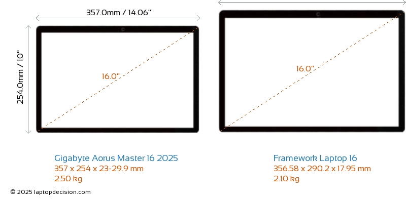 USB Aorus Master 16 2025 is equipped with 2x USB 3.2 USB-A ports. Laptop 16 does not have USB-A ports.Both Aorus Master 16 2025 and Laptop 16 have USB Type-C ports. Aorus Master 16 2025 has 2x USB 4.0 USB Type-C ports, while Laptop 16 has 4x USB 4.0 USB Type-C ports.