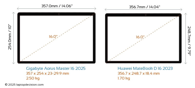 Thunderbolt Aorus Master 16 2025 is equipped with Thunderbolt 5 port. MateBook D 16 2023 does not have Thunderbolt port.