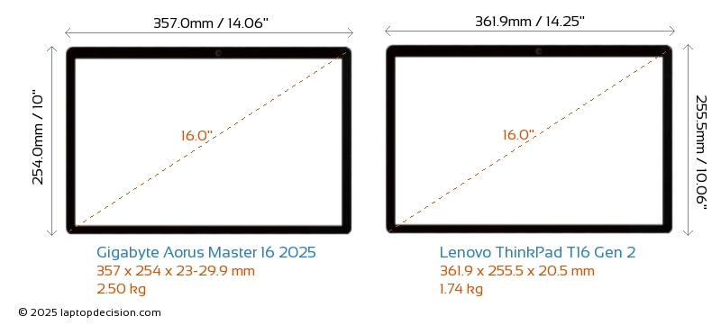 HDMIBoth Aorus Master 16 2025 and ThinkPad T16 Gen 2 feature an HDMI port. Aorus Master 16 2025 offers 1x HDMI 2.1, while ThinkPad T16 Gen 2 offers 1x HDMI 2.0.