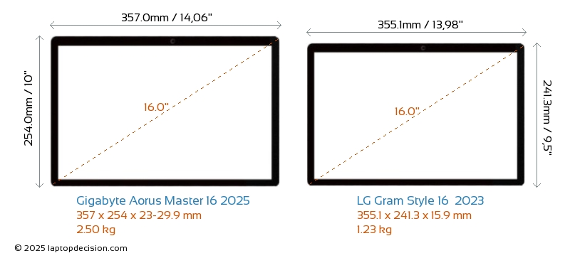 HDMI Aorus Master 16 2025 features an HDMI port (1x HDMI 2.1) for connecting to external monitors. Gram Style 16 2023 does not have an HDMI port.
