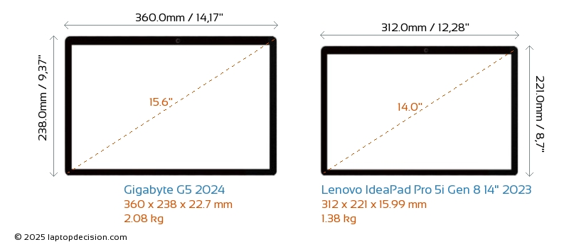 HDMIBoth G5 2024 and IdeaPad Pro 5i Gen 8 14" 2023 feature an HDMI port. G5 2024 offers 1x HDMI 2.1, while IdeaPad Pro 5i Gen 8 14" 2023 offers 1x HDMI 2.0.