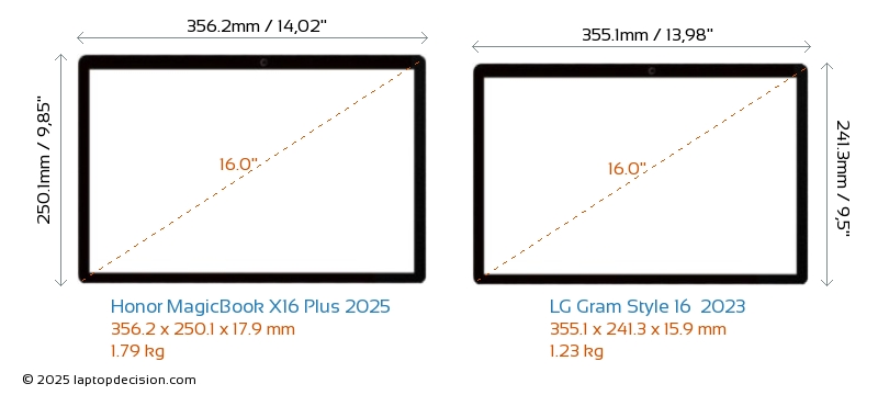 HDMI MagicBook X16 Plus 2025 features an HDMI port (1x HDMI 1.4) for connecting to external monitors. Gram Style 16 2023 does not have an HDMI port.