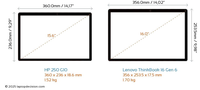 HDMIBoth 250 G10 and ThinkBook 16 Gen 6 feature an HDMI port. 250 G10 offers 1x HDMI 1.4, while ThinkBook 16 Gen 6 offers 1x HDMI 2.1.