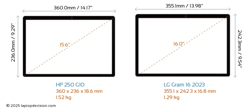 HDMIBoth 250 G10 and Gram 16 2023 feature an HDMI port. 250 G10 offers 1x HDMI 1.4, while Gram 16 2023 offers 1x HDMI 2.0.