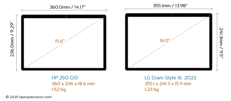 HDMI 250 G10 features an HDMI port (1x HDMI 1.4) for connecting to external monitors. Gram Style 16 2023 does not have an HDMI port.