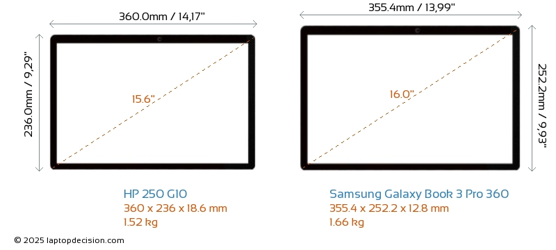 HDMIBoth 250 G10 and Galaxy Book 3 Pro 360 feature an HDMI port (1x HDMI 1.4) for connecting to external monitors.