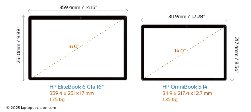 HDMI EliteBook 6 G1a 16" features an HDMI port (1x HDMI 2.1) for connecting to external monitors. OmniBook 5 14 does not have an HDMI port.