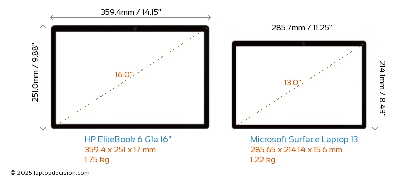 HDMI EliteBook 6 G1a 16" features an HDMI port (1x HDMI 2.1) for connecting to external monitors. Surface Laptop 13 does not have an HDMI port.