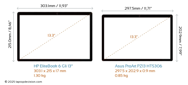 HDMI EliteBook 6 G1i 13" features an HDMI port (1x HDMI 2.1) for connecting to external monitors. ProArt PZ13 HT5306 does not have an HDMI port.