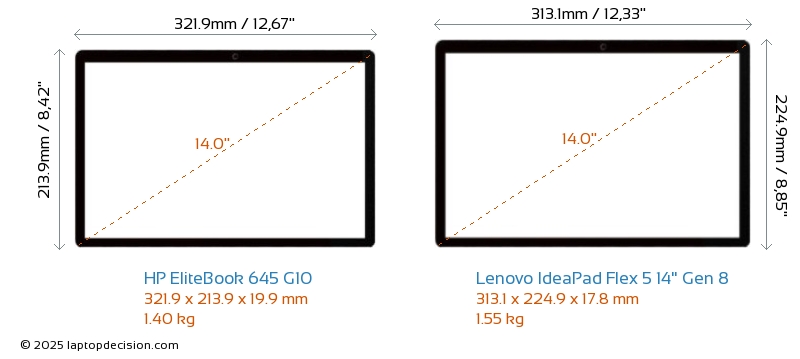 HDMIBoth EliteBook 645 G10 and IdeaPad Flex 5 14" Gen 8 feature an HDMI port. EliteBook 645 G10 offers 1x HDMI 2.1, while IdeaPad Flex 5 14" Gen 8 offers 1x HDMI 1.4.