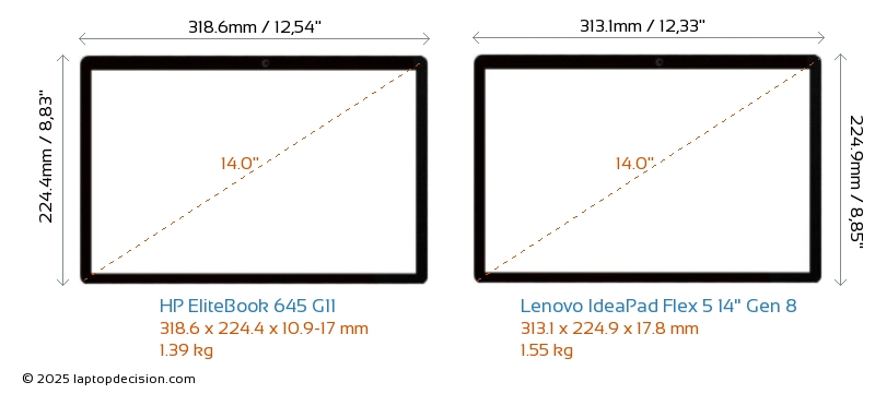 HDMIBoth EliteBook 645 G11 and IdeaPad Flex 5 14" Gen 8 feature an HDMI port. EliteBook 645 G11 offers 1x HDMI 2.1, while IdeaPad Flex 5 14" Gen 8 offers 1x HDMI 1.4.