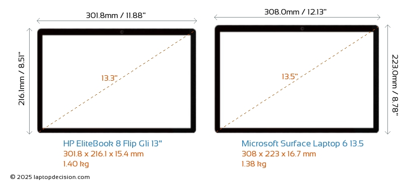 HDMI EliteBook 8 Flip G1i 13" features an HDMI port (1x HDMI 2.1) for connecting to external monitors. Surface Laptop 6 13.5 does not have an HDMI port.