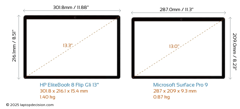 HDMI EliteBook 8 Flip G1i 13" features an HDMI port (1x HDMI 2.1) for connecting to external monitors. Surface Pro 9 does not have an HDMI port.