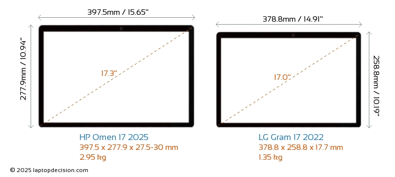HDMIBoth Omen 17 2025 and Gram 17 2022 feature an HDMI port. Omen 17 2025 offers 1x HDMI 2.1, while Gram 17 2022 offers 1x HDMI 2.0.