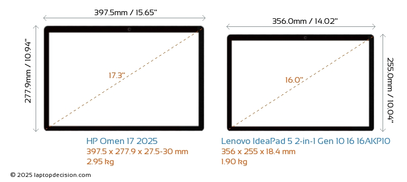 HDMIBoth Omen 17 2025 and IdeaPad 5 2-in-1 Gen 10 16 16AKP10 feature an HDMI port. Omen 17 2025 offers 1x HDMI 2.1, while IdeaPad 5 2-in-1 Gen 10 16 16AKP10 offers 1x HDMI 1.4.