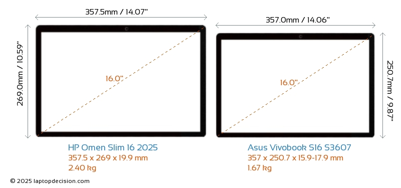 HDMIBoth Omen Slim 16 2025 and Vivobook S16 S3607 feature an HDMI port (1x HDMI 2.1) for connecting to external monitors.