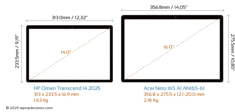 HDMIBoth Omen Transcend 14 2025 and Nitro 16S AI AN16S-61 feature an HDMI port (1x HDMI 2.1) for connecting to external monitors.