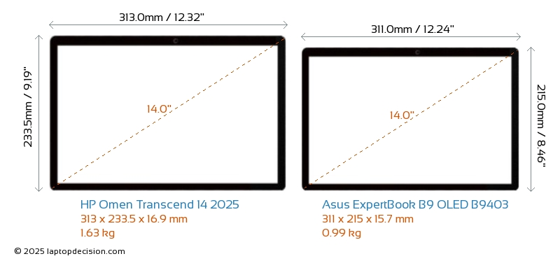 ThunderboltBoth Omen Transcend 14 2025 and ExpertBook B9 OLED B9403 are equipped with Thunderbolt 4 ports.