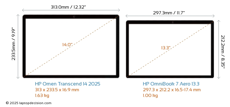 Audio JackBoth Omen Transcend 14 2025 and OmniBook 7 Aero 13.3 are equipped with a 3.5mm Audio Jack, providing seamless connection to headphones and speakers.