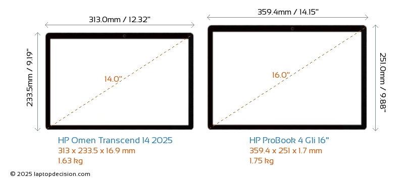 HDMIBoth Omen Transcend 14 2025 and ProBook 4 G1i 16" feature an HDMI port (1x HDMI 2.1) for connecting to external monitors.