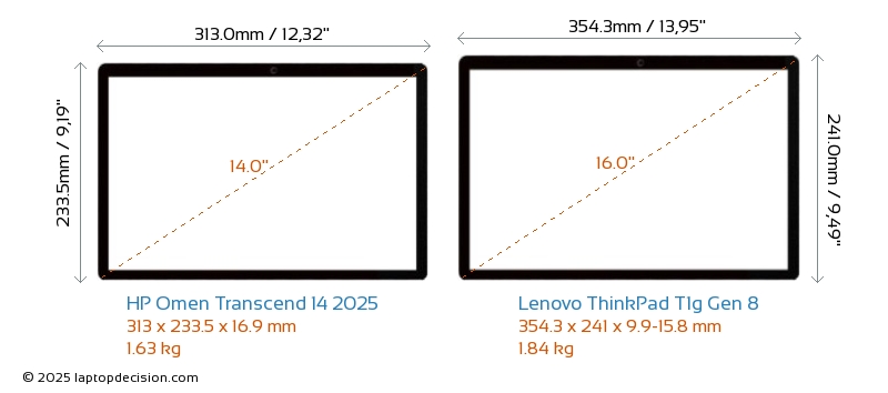 HDMIBoth Omen Transcend 14 2025 and ThinkPad T1g Gen 8 feature an HDMI port (1x HDMI 2.1) for connecting to external monitors.